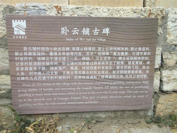 村居房舍大都以石頭壘砌,頗有特色。石屋,石街,石道,石墻,狗窩、雞窩、石槽、石臼是石頭的,就連一些日常器具都是石頭的。走進(jìn)村里儼然走進(jìn)一座石頭城堡。房上石頭各有其名:里檐、脊檐、挑翅、擋捎、腰枕、拴馬石……陡峭的擋捎上掛著長長的壓捎石。挑翅、擋捎、壓捎石之間用由子、桪子相互“擒”著,像掛在空中一樣。這里的一切記載著臥云鋪人自古以來勤勞、團(tuán)結(jié)、善良、寬容的美德。